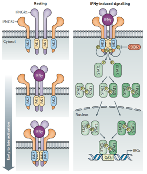 When the IFN-γ homodimer binds to the IFN-γR1/IFN-γR2 heterodimeric receptor on the target cell membrane, it first activates the JAK kinases (JAK1 and JAK2) coupled to the intracellular domain of the receptor. The activated JAK kinases undergo autophosphorylation and further phosphorylate the tyrosine residues of the receptor, forming "signal anchor sites." Subsequently, STAT1 molecules in the cytoplasm are recruited to the phosphorylated sites of the receptor and undergo tyrosine phosphorylation catalyzed by JAK kinases. The phosphorylated STAT1 molecules rapidly form homodimers (i.e., GAF complexes).